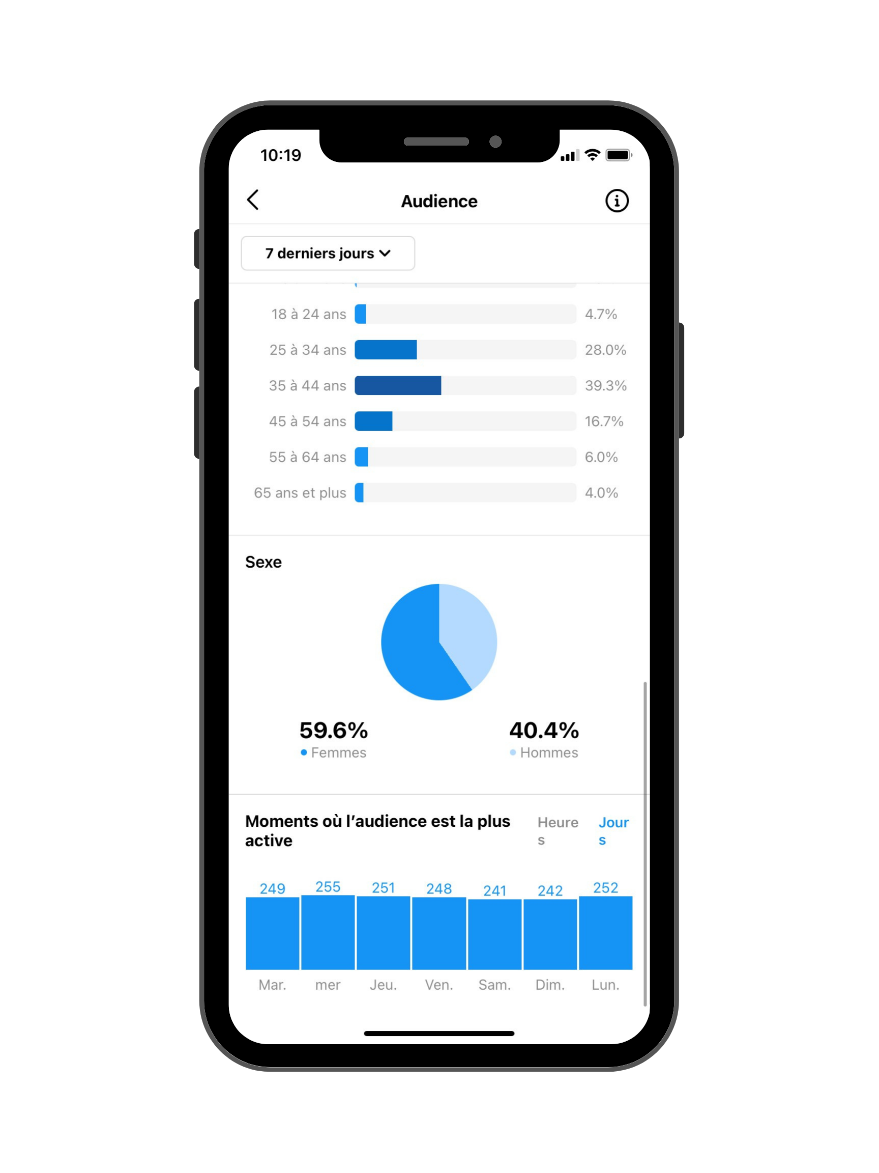 Pour connaître ces données, il vous suffit d’aller dans la section Statistiques de votre compte Instagram professionnel. Ensuite, dans les statistiques, allez dans Votre audience et cliquez sur Afficher tout. C’est là que la magie se passe : vous voyez les lieux principaux (villes et pays) où se trouve votre public ET les moments où il est le plus actif. Par exemple, dans le cas ci-dessous, nous publierons sous le fuseau horaire du Canada les lundis à 18 h, les mercredis à 18 h et les jeudis à 9 h.